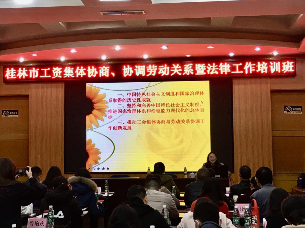 為深入貫徹黨的十九大精神,進一步做好我市集體協(xié)商工作,提高協(xié)調(diào)勞動關(guān)系工作質(zhì)量,拓寬工會和人社基層干部法律業(yè)務(wù)知識,11月25日,2020年工資集體協(xié)商、協(xié)調(diào)勞動關(guān)系暨法律工作培訓班在桂林山水大酒店舉辦,培訓班由市總工會權(quán)益保障部、社會聯(lián)絡(luò)部、市人社局勞動關(guān)系科聯(lián)合主辦,桂林市工會干部學校(桂林市職工大學)承辦。