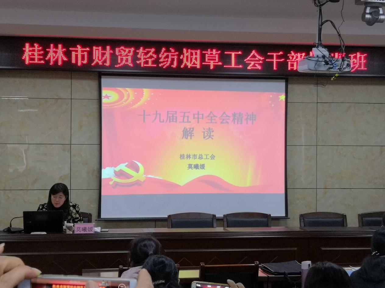 會議首先由桂林市總工會黨組成員、副主席莫曦媛同志對十九屆五中全會精神作了深入淺出的解讀。本次培訓(xùn)還邀請市總工會和法律機(jī)構(gòu)的領(lǐng)導(dǎo)、專家,就廣西云平臺工會組織和會員信息錄入操作、民法典知識、工會日常工作實務(wù)等開展了專題講座。