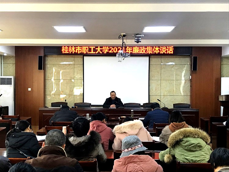 新年伊始,春節(jié)臨近,為貫徹黨中央、自治區(qū)黨委教育工委以及桂林市關于全面從嚴治黨反腐倡廉的部署,落實市總工會黨委、市紀委監(jiān)委駐市政協(xié)機關紀檢監(jiān)察組的工作要求,提高黨員和干部忠誠履職、廉潔自律的自覺性,及時發(fā)現(xiàn)和糾正干部隊伍建設中存在的傾向性、苗頭性問題,不斷增強干部隊伍的凝聚力和向心力,1月14日下午,桂林市職工大學組織召開了2021年廉政集體談話會。