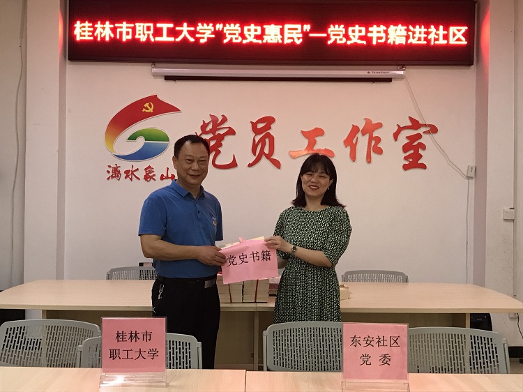 為把黨史學(xué)習(xí)教育落到實(shí)處,普及黨史知識(shí),營(yíng)造社區(qū)重視黨史、學(xué)習(xí)黨史的良好氛圍,切實(shí)為群眾辦實(shí)事辦好事,6月8日,桂林市職工大學(xué)組織黨員干部走進(jìn)大黨委共建單位象山區(qū)南門街道東安社區(qū)贈(zèng)送黨史書籍,積極發(fā)揮黨史惠民、以史鑄魂作用。