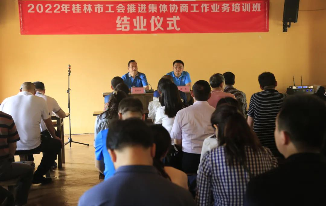 5月31日至6月2日,桂林市總工會(huì)主辦、我校承辦的2022年桂林市工會(huì)推進(jìn)集體協(xié)商工作業(yè)務(wù)培訓(xùn)班在陽(yáng)朔順利舉辦。來(lái)自桂林各縣(市)、區(qū)總工會(huì)、產(chǎn)業(yè)工會(huì)、市直工會(huì)等50多個(gè)單位的工會(huì)主席、副主席、集體協(xié)商指導(dǎo)員、工會(huì)干部等近120人參加培訓(xùn)。市總工會(huì)黨組成員曹春新出席培訓(xùn)會(huì)。