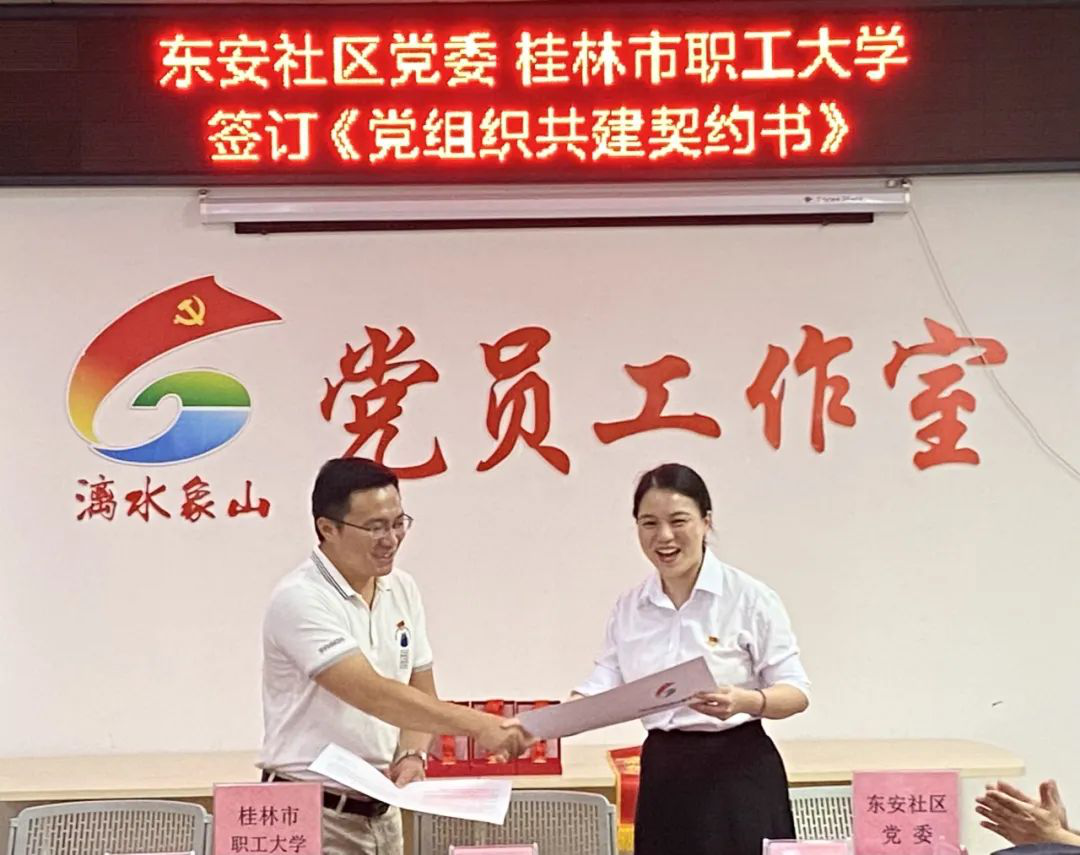活動(dòng)于6月30日上午在東安社區(qū)黨員活動(dòng)中心舉行。首先,桂林市職工大學(xué)黨支部書(shū)記、校長(zhǎng)蔣大為與東安社區(qū)黨委書(shū)記、主任萬(wàn)霞共同簽署了《基層黨建共建契約書(shū)》,這標(biāo)志著雙方黨建共建工作正式啟動(dòng),雙方將在黨建共建的平臺(tái)上,就基層組織建設(shè)、理論宣講、結(jié)對(duì)幫扶、特色活動(dòng)和志愿服務(wù)等方面進(jìn)行廣泛合作和深度對(duì)接。