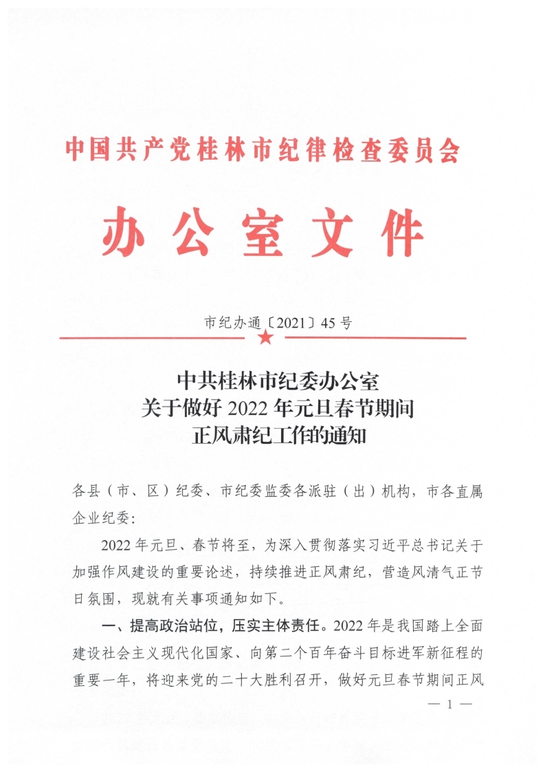 中共桂林市紀委辦公室關(guān)于做好2022年元旦春節(jié)期間正風肅紀工作的通知