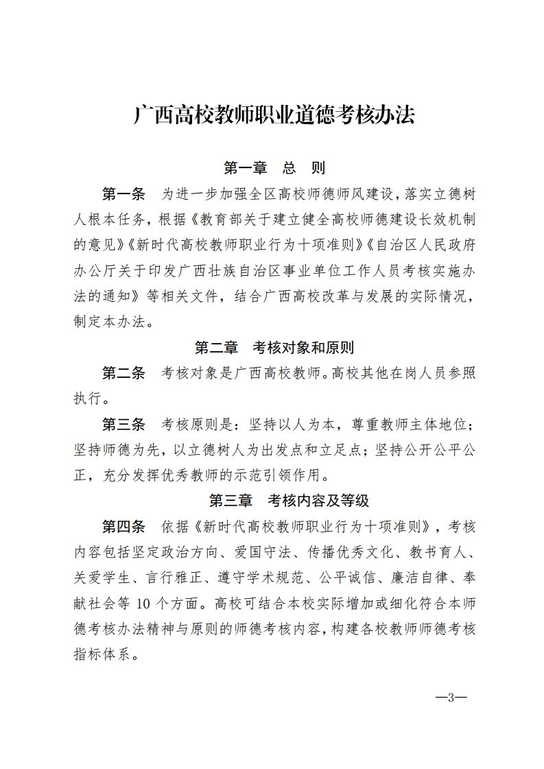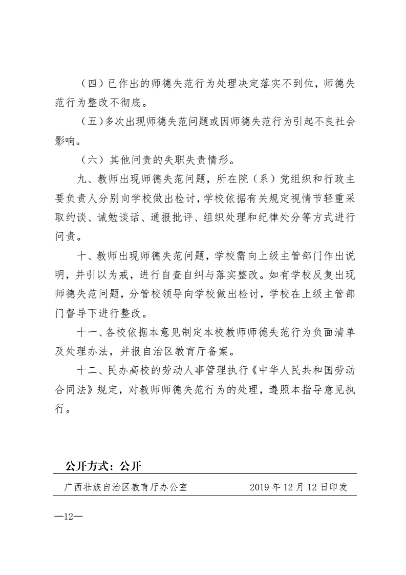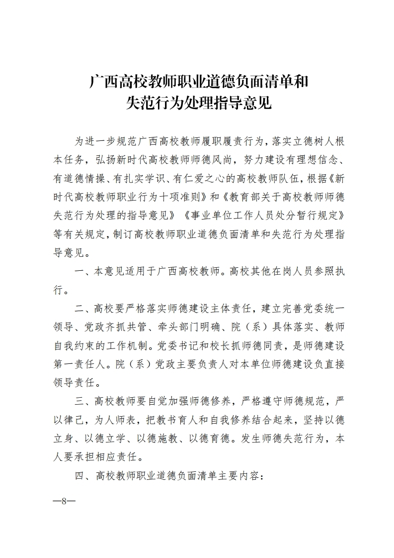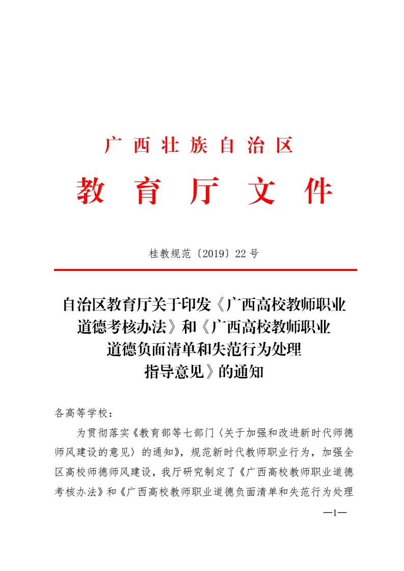 桂教規(guī)范〔2019〕22號自治區(qū)教育廳關(guān)于印發(fā)《廣西高校教師職業(yè)道德考核辦法》和《廣西高校教師職業(yè)道德負(fù)面清單和失范行為處理指導(dǎo)意見》的通知