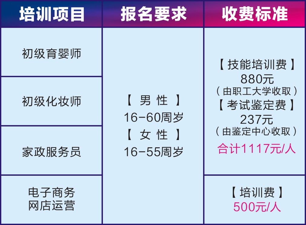 備注:符合國家政策的五大類人員(農(nóng)村轉(zhuǎn)移就業(yè)勞動者、城鎮(zhèn)登記失業(yè)人員、貧困家庭子女(指建檔立卡貧困家庭、城鄉(xiāng)低保家庭、城鎮(zhèn)零就業(yè)家庭子女)、畢業(yè)年度高校畢業(yè)生(含技師學(xué)院高級工班、預(yù)備技師班和特殊教育院校職業(yè)教育類畢業(yè)生)、城鄉(xiāng)未繼續(xù)升學(xué)的應(yīng)屆初高中畢業(yè)生)可申請國家補(bǔ)貼享受免費(fèi)培訓(xùn)。詳情請?jiān)儐柭毠ご髮W(xué)職工教育培訓(xùn)部,聯(lián)系電話:0773-2110002/0773-2110013(傳真)。