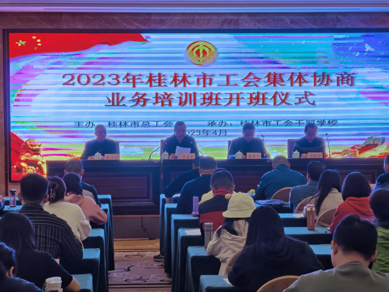 4月14日,桂林市總工會(huì)主辦、我校承辦的2023年桂林市工會(huì)集體協(xié)商業(yè)務(wù)培訓(xùn)班在龍勝縣圓滿結(jié)束。市協(xié)調(diào)勞動(dòng)關(guān)系三方委員會(huì)成員單位領(lǐng)導(dǎo)、各縣(市、區(qū))總工會(huì)分管領(lǐng)導(dǎo)、新培育典型企業(yè)(行業(yè))工會(huì)主席、工資集體協(xié)商專職指導(dǎo)員,市直管企業(yè)工會(huì)主席、有關(guān)產(chǎn)業(yè)工會(huì)主席和有關(guān)產(chǎn)業(yè)工會(huì)所屬企業(yè)工會(huì)主席、市直管行業(yè)工會(huì)主席及工會(huì)干部等近100人參加培訓(xùn)。市總工會(huì)黨組成員曹春新、市人力資源和社會(huì)保障局副局長朱桂平、市工商聯(lián)經(jīng)濟(jì)聯(lián)絡(luò)部部長洪世兵、市企業(yè)與企業(yè)家聯(lián)合會(huì)秘書長王紅軍出席開班儀式。