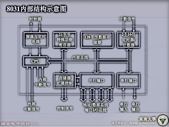 8051單片機包含中央處理器(CPU)、程序存儲器(ROM)、數(shù)據(jù)存儲器(RAM)、定時/計數(shù)器、并行接口、串行接口和中斷系統(tǒng)等幾大單元及數(shù)據(jù)總線、地址總線和控制總線等三大總線。