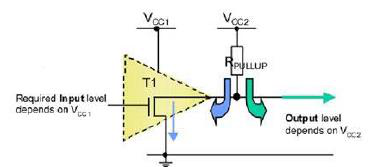 如圖2, IC的邏輯電平由電源Vcc1決定,而輸出高電平則由Vcc2決定。這樣我們就可以用低電平邏輯控制輸出高電平邏輯了。